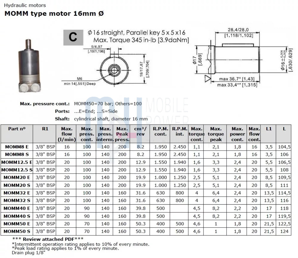 Hidromotorul MOMM8 S, extrem de compact și cu cilindree mică, este foarte potrivit pentru sarcini de acționare hidraulică ușoare, cum ar fi acționarea utilajelor mici și a sistemelor de dozare și poziționare. Arborele de 16 mm asigură o transmisie precisă și fiabilă a cuplului, în timp ce construcția rezistentă a motorului oferă siguranță în exploatare pe termen lung. Marcajul „S" se referă la racordurile laterale (side), cu dimensiunea de 3/8" BSP. Varianta cu cilindree de 8,2 cm³/rot poate atinge turații ridicate, fiind alegerea perfectă pentru sistemele hidraulice cu funcționare rapidă.