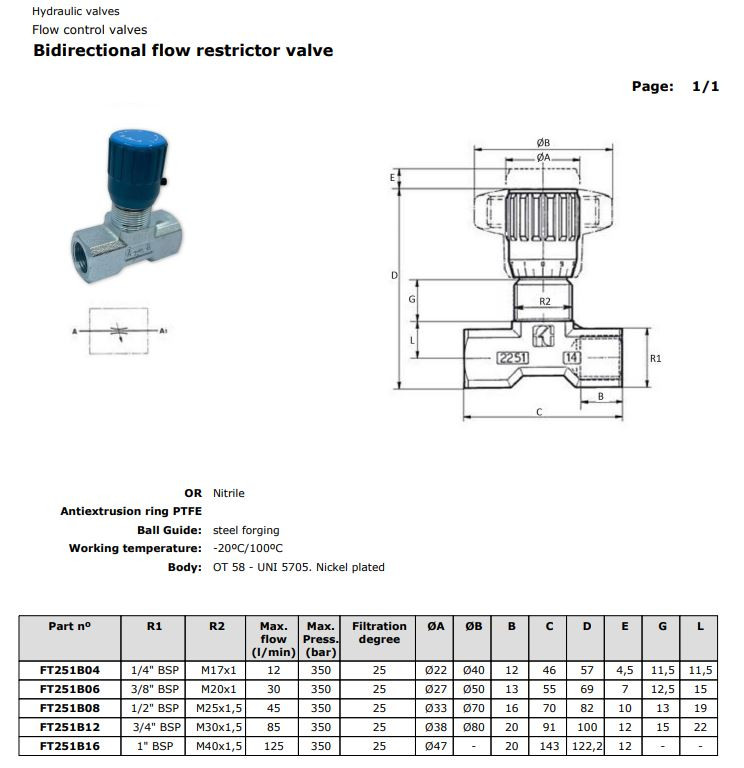 Supapa de reglare fină a debitului FT251B06 este un regulator bidirecțional destinat sistemelor hidraulice cu debit ridicat. Permite reglarea precisă și continuă a vitezei actuatorilor, în ambele sensuri. Carcasa din alamă nichelată și componentele interne durabile asigură o funcționare stabilă și de lungă durată.